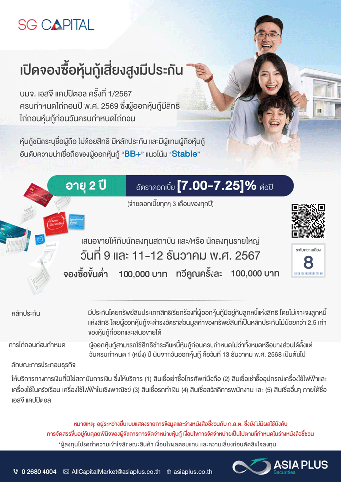 เปิดจองหุ้นกู้เสี่ยงสูงมีประกันบริษัทเอสจีแคปปิตอลจำกัด(มหาชน)- SGC